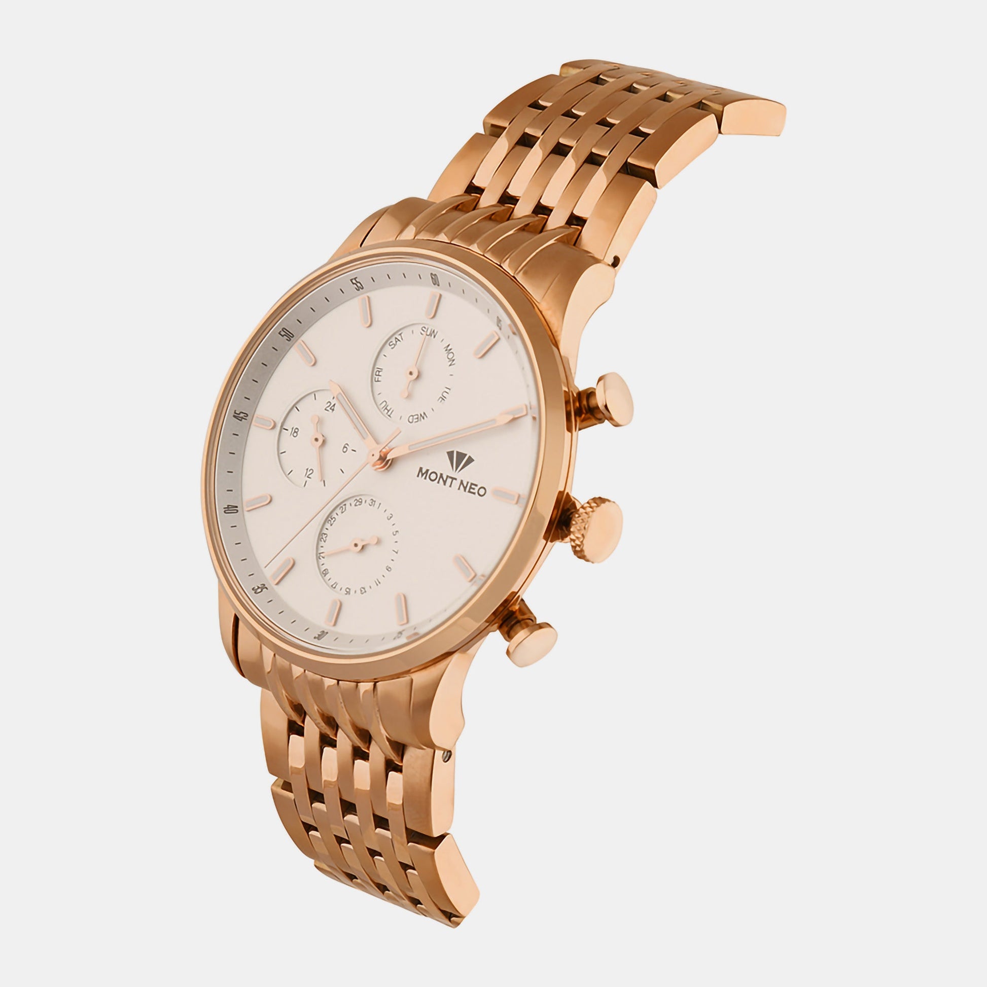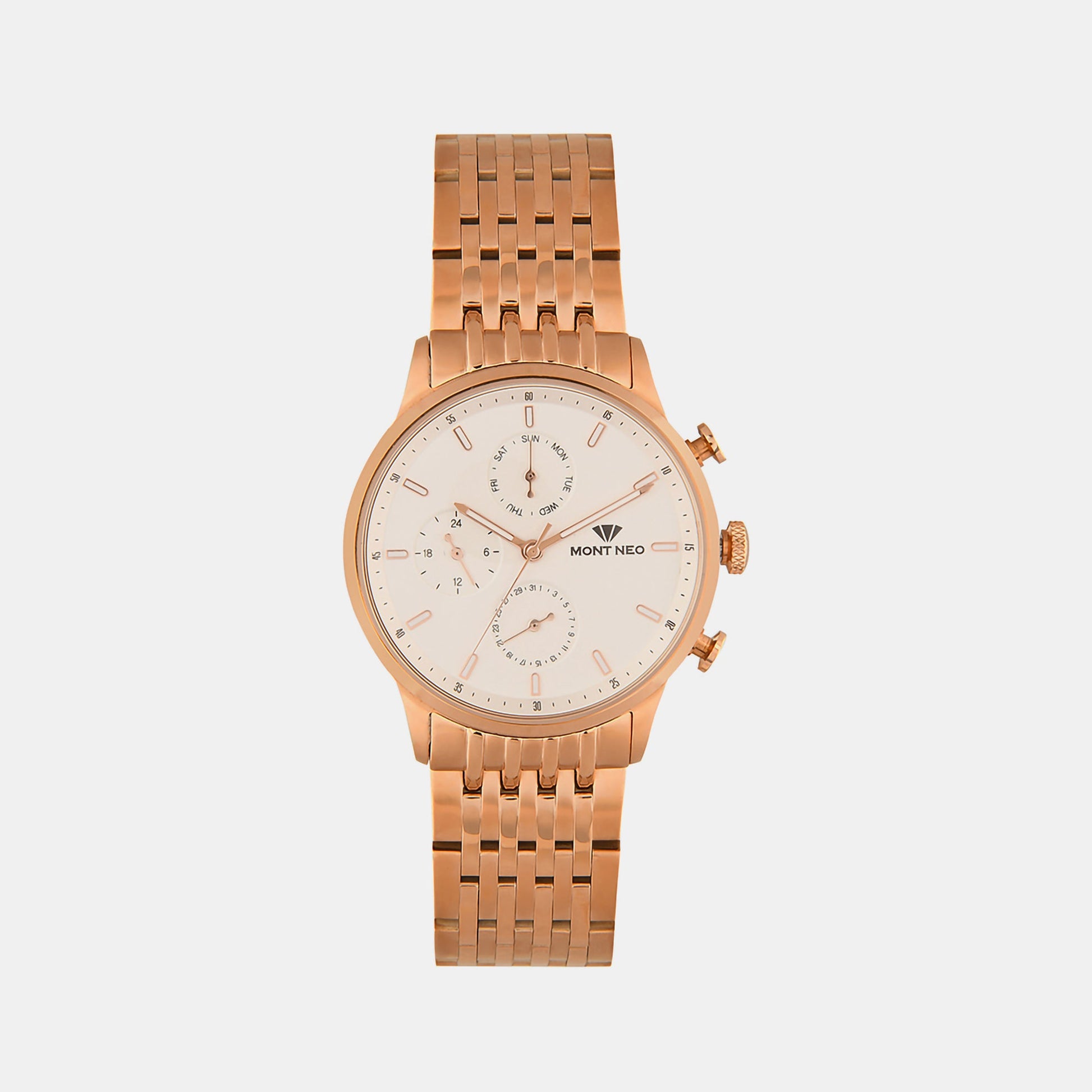 Elevate your formal look with this analog watch. The 44mm round case, silver stainless steel dial, and quartz movement create a harmonious blend of style and precision. The rose gold stainless steel strap, 22mm wide and secured with a butterfly clasp, adds a touch of elegance. Water-resistant up to 3 ATM, it's an ideal accessory for formal occasions. Weighing 120gm and 10mm thick, this watch is a perfect balance of sophistication and functionality. Crafted in India, it comes with a 2-year warranty.